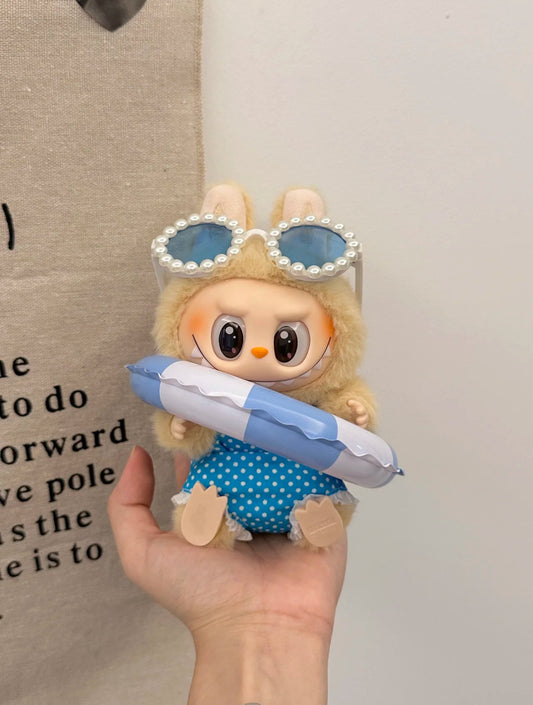 17cm Labubu-Blue Polka Dot Swimsuit + Striped Inflatable Ring + Retro Blue Shades