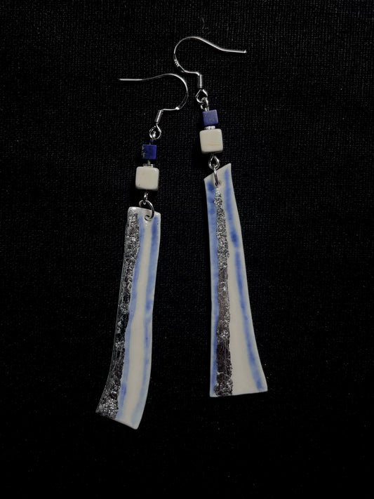 Feather Sliver Earrings - Delicate Blue & White Narrow Trapezoid