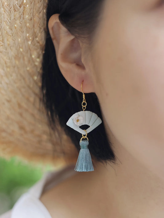 Chinese Style Folding Fan Earrings-Handmade Soft Polymer Clay-Tassel Drop