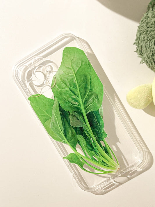 Clear Transparent Spinach Design Phone Case for iPhone 16/15/14/13/12/11 Pro/Max - Realistic Vegetable Art Cover